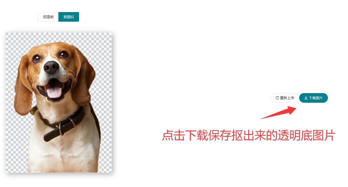 4、待網(wǎng)站將這個(gè)狗狗的圖片摳出來(lái)之后我們就會(huì)看到如下圖所示的PNG透明底前后對(duì)比圖,確認(rèn)沒(méi)問(wèn)題的情況下即可點(diǎn)擊下載按鈕將處理好的圖片下載到本地保存使用;