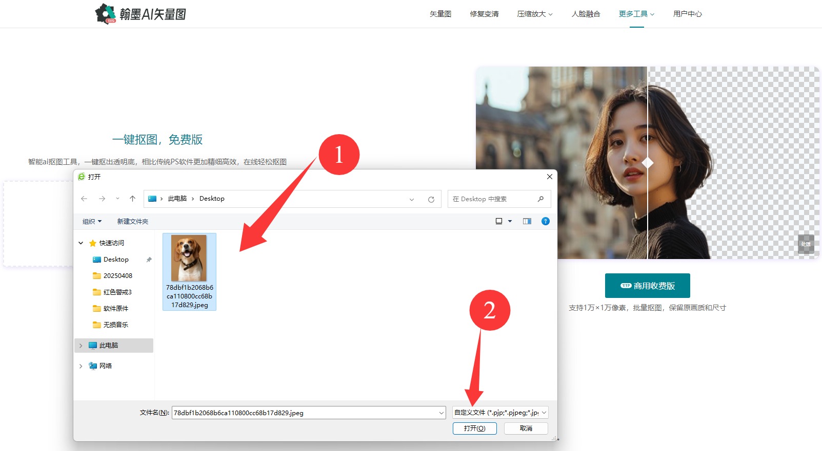 2、打開(kāi)翰墨AI摳圖網(wǎng)頁(yè)版工具,點(diǎn)擊上傳入口,然后按照下圖所示選擇本地圖片,然后點(diǎn)擊上傳;如果圖片是jpeg、gif等非常規(guī)位圖的請(qǐng)先轉(zhuǎn)換為JPG圖片,不然可以會(huì)導(dǎo)致識(shí)別不了的問(wèn)題;